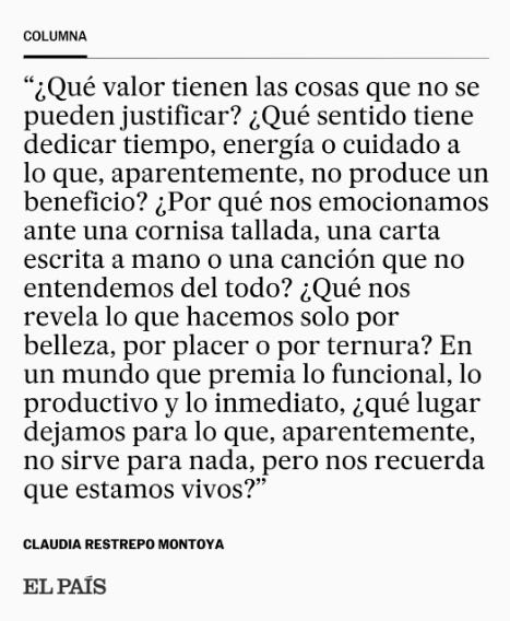 💬 Reflexión - Meditación sobre las cosas bellas. En el diario El País apareció esta semana una columna de Claudia Restrepo invitando a reflexionar sobre el rol de lo inútil, de lo bello pero “improductivo” en nuestras vidas.